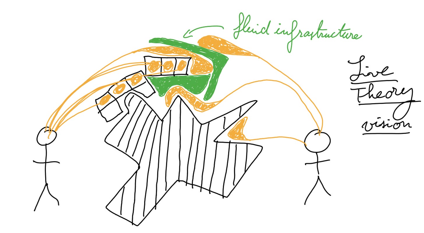A note on terminology. I use “Live Theory” (capitalized) for the name of the whole vision, shortened to “the live vision” for brevity. It is a hypothetical world in which our infrastructure and artefacts are “fluid” or “live”. I say “a live theory”, to talk about a new kind of artefact that replaces the classic “theory” from the systematic world.